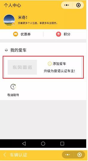 返回東風(fēng)雷諾車友會主頁面,點擊左下角菜單欄【個人中心】,進入車主認證通道。